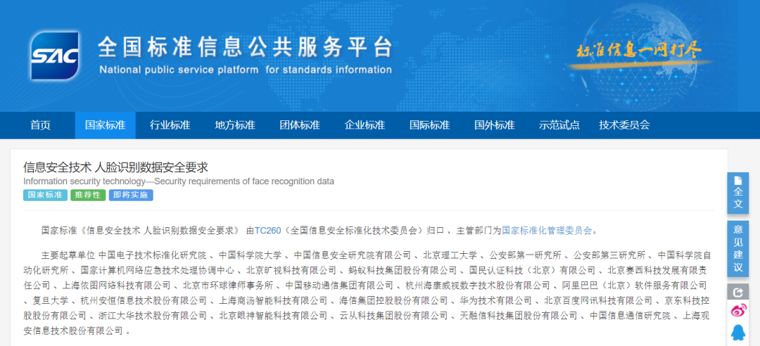 国家标准:人脸识别数据安全要求